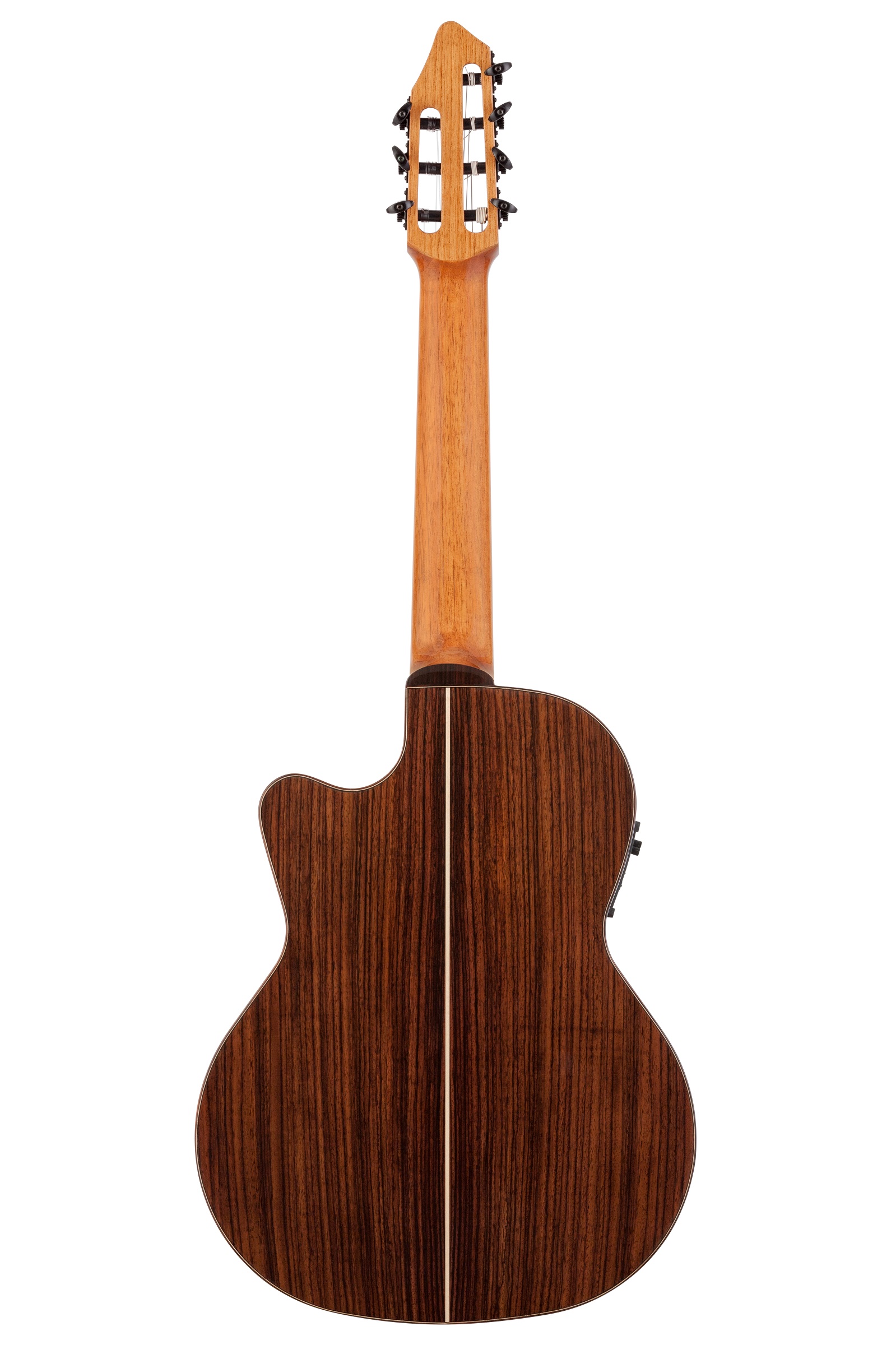 Mit ihrer massiven Western Red Cedar-Decke und vollmassiven Indian Rosewood Boden & Zargen kombiniert sie Wärme, Projektion und präzise Artikulation – ideal für Standard-Tuning mit tiefem B oder Romany Open G.