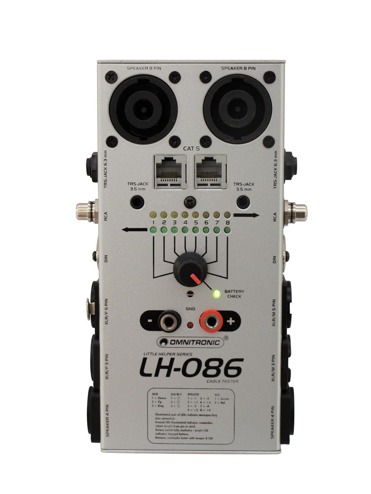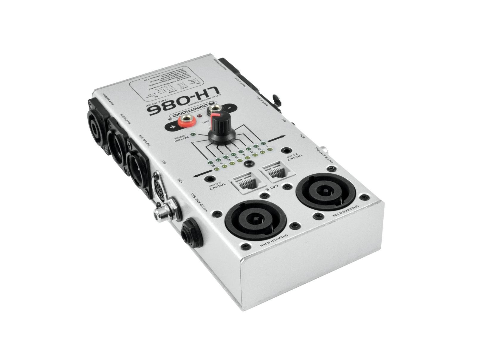 Der OMNITRONIC LH-086 überprüft die Funktion von 3 und 5-poligen XLR-, 3,5/6,3-mm-Klinken- (auch Stereo), CAT5, DIN-, Cinch- und 4 sowie 8-poligen Speaker-Kabeln und Steckverbindungen. Zur einfacheren Kontrolle lässt sich die Polarität bzw. vorhandene Kurzschlüsse an einer Anzeige ablesen. Auch der Test des Durchgangssignals ist über zwei Bananenbuchsen möglich.