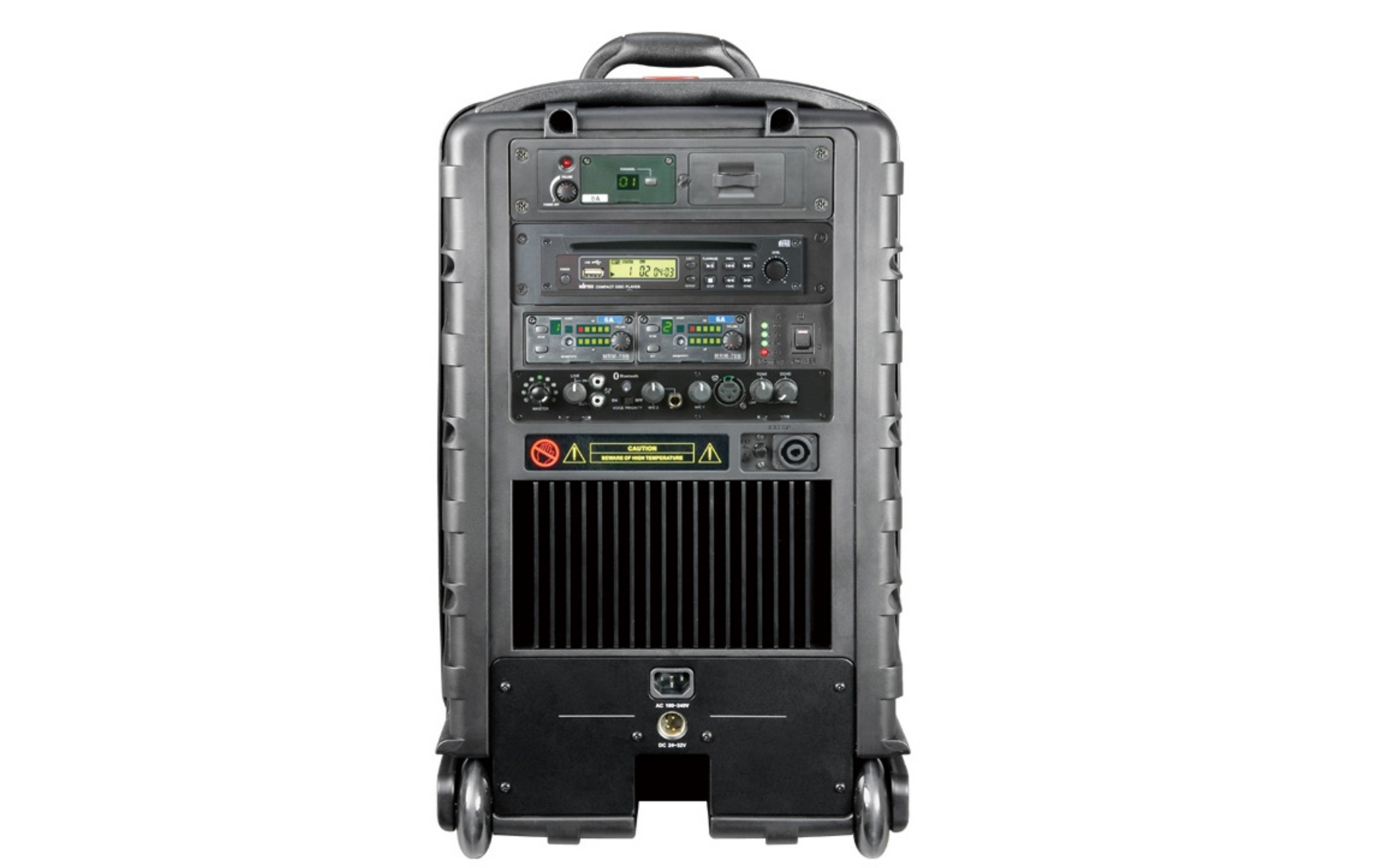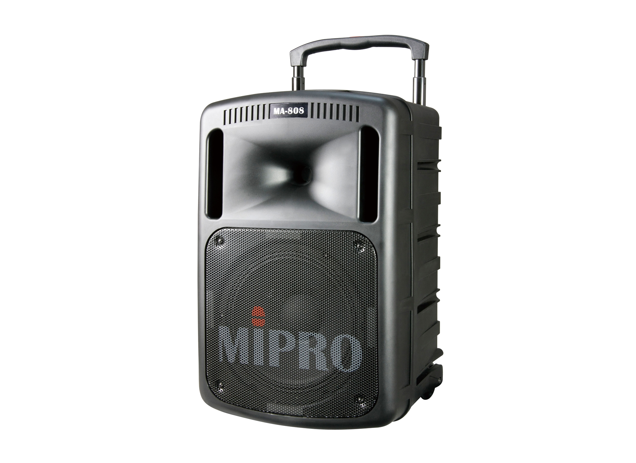 12 V Akkus ist eine zuverlässige kabellose Stromversorgung und eine lange Betriebszeit garantiert. Der stabile Tragegriff und der Stativflansch ermöglichen einen schnellen und einfachen Aufbau in nahezu jeder Umgebung. Das eingebaute Trolley-System mit ausziehbarem Haltegriff und Rollen ermöglicht einen einfachen und schnellen Transport und gewährleistet hohe Mobilität. Extrem robust, batteriebetrieben und bedienerfreundlich, erfüllt das MA-808 jegliche Anforderungen von Veranstaltungen mit großem Publikum und kann sich bedenkenlos auf den großen Bühnen und bei großen Veranstaltungen sehen lassen.