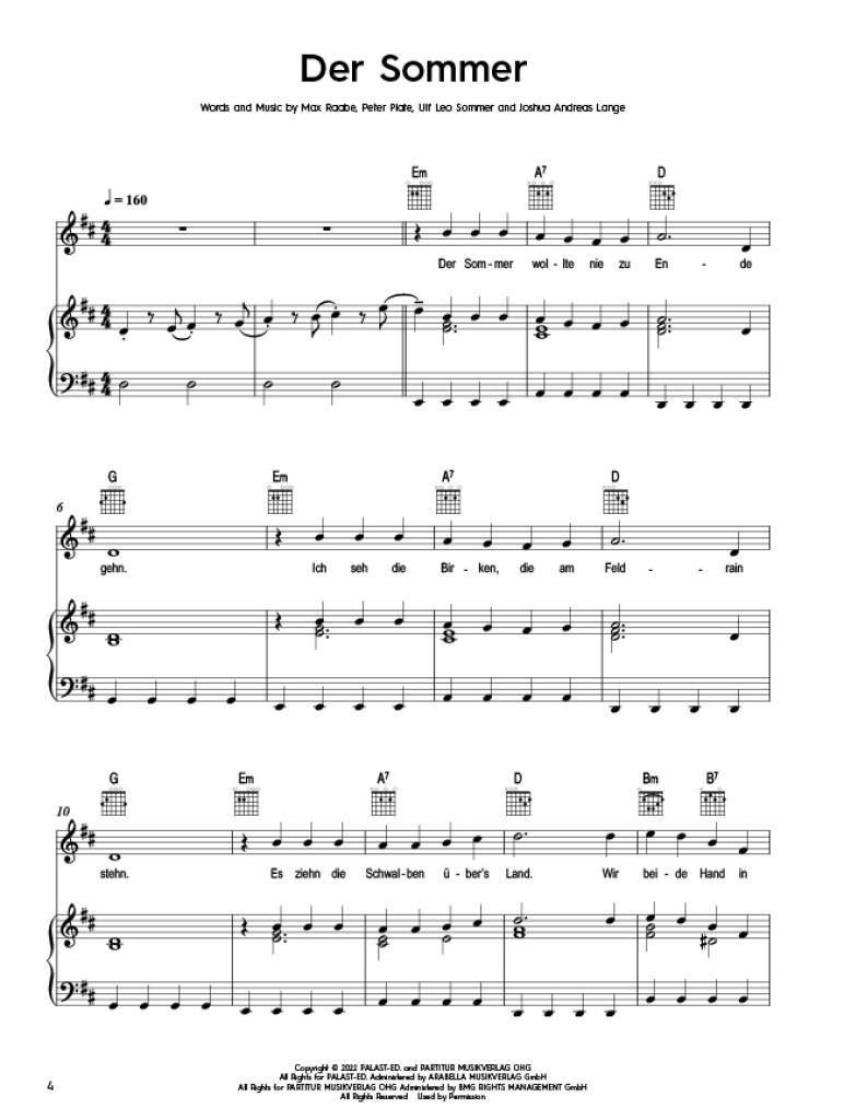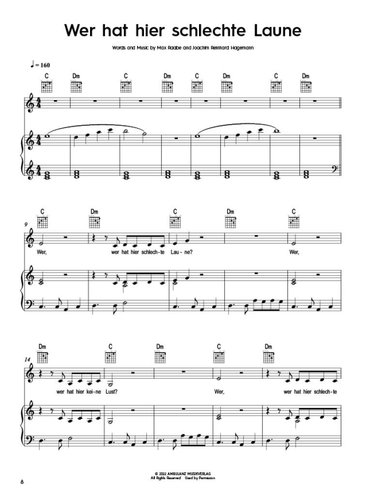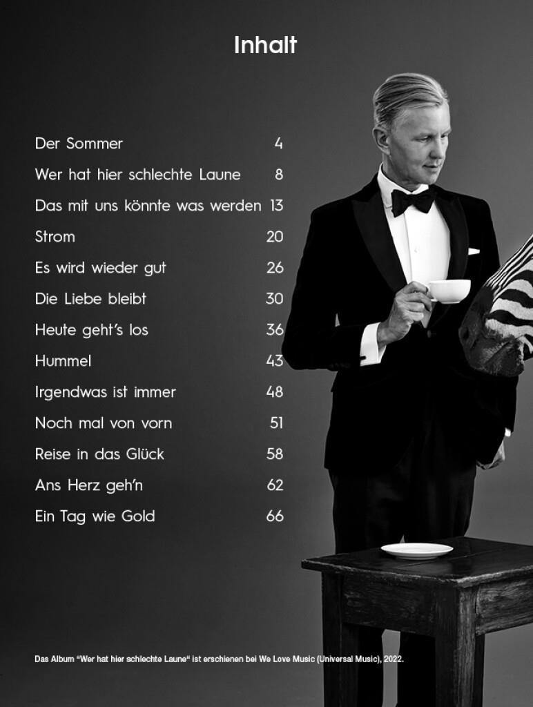 Wer hat hier schlechte Laune, fragt Max Raabe mit seinem neuen Album und singt von der Liebe, von ihrem zarten Erblühen und Verwehen, von Gefühlen und ihrer Verwirrung. Es geht um die Verquickung von Glück und Zweifel, von Euphorie und Unsicherheit, von der Freude am anderen und dem Hadern mit sich selbst. Entdecke Max Raabe’s Album „Wer hat hier schlechte Laune“ auf eine ganz neue Weise mit unserem Songbook. Es enthält die Klaviernoten, Texte und Gitarrenakkorde für 13 Stücke des Albums. Auch das wunderschöne „Ein Tag wie Gold“ aus der Erfolgsserie „Babylon Berlin“ ist dabei. Mit unseren sorgfältig arrangierten Klaviernoten kannst du die Musik von Max Raabe authentisch wiedergeben, egal ob du schon fortgeschritten am Klavier oder noch am Anfang bist. Die Texte sind ebenfalls notiert, so dass du die Lieder singen kannst, während die Gitarrenakkorde es dir ermöglichen, die Songs auf der Gitarre zu begleiten. Dieses Songbook bietet dir die Möglichkeit, die charakteristisch-zeitlose Musik von Max Raabe in deinem eigenen Zuhause zu genießen und zu spielen.