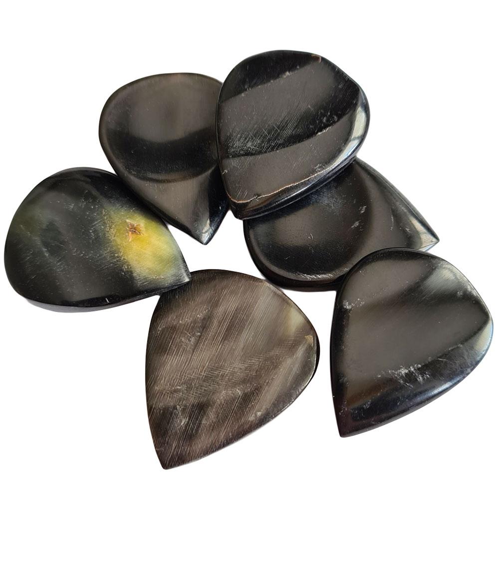 Dieses Gitarrenplektrum aus echtem Horn vereint natürliche Ästhetik mit warmem, musikalischem Klangcharakter. Die schwarze Grundfarbe wird durch individuell verlaufende hellere Marmorierungen ergänzt – jedes Pick ist ein Unikat mit natürlichem Charme. Handgefertigt in Madagaskar, überzeugt dieses Plektrum durch seine angenehme Haptik, ausgewogene Härte und hochwertige Verarbeitung.