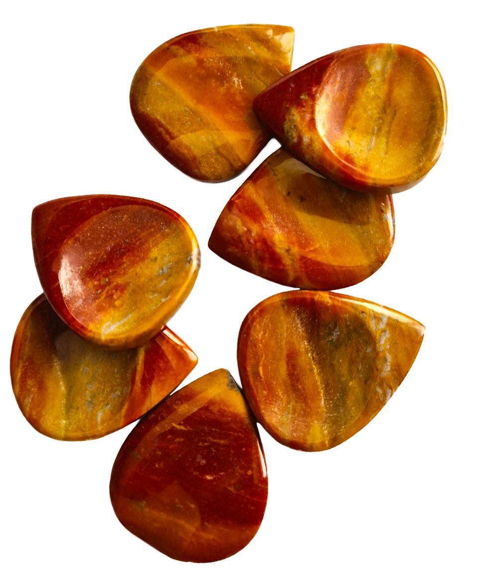 Der verwendete Jaspis ist eine mikrokristalline, feinkörnige Quarzvarietät, deren Färbung durch natürliche Eisen- oder Manganbeimengungen entsteht. Die geschliffene, harte Oberfläche garantiert Langlebigkeit ohne sichtbare Abnutzung – selbst bei regelmäßigem Einsatz. Das Pick liefert einen definierten, eher kühlen Klang mit präziser Ansprache – perfekt für rhythmisch exaktes Spiel und nuancierte Dynamik.
