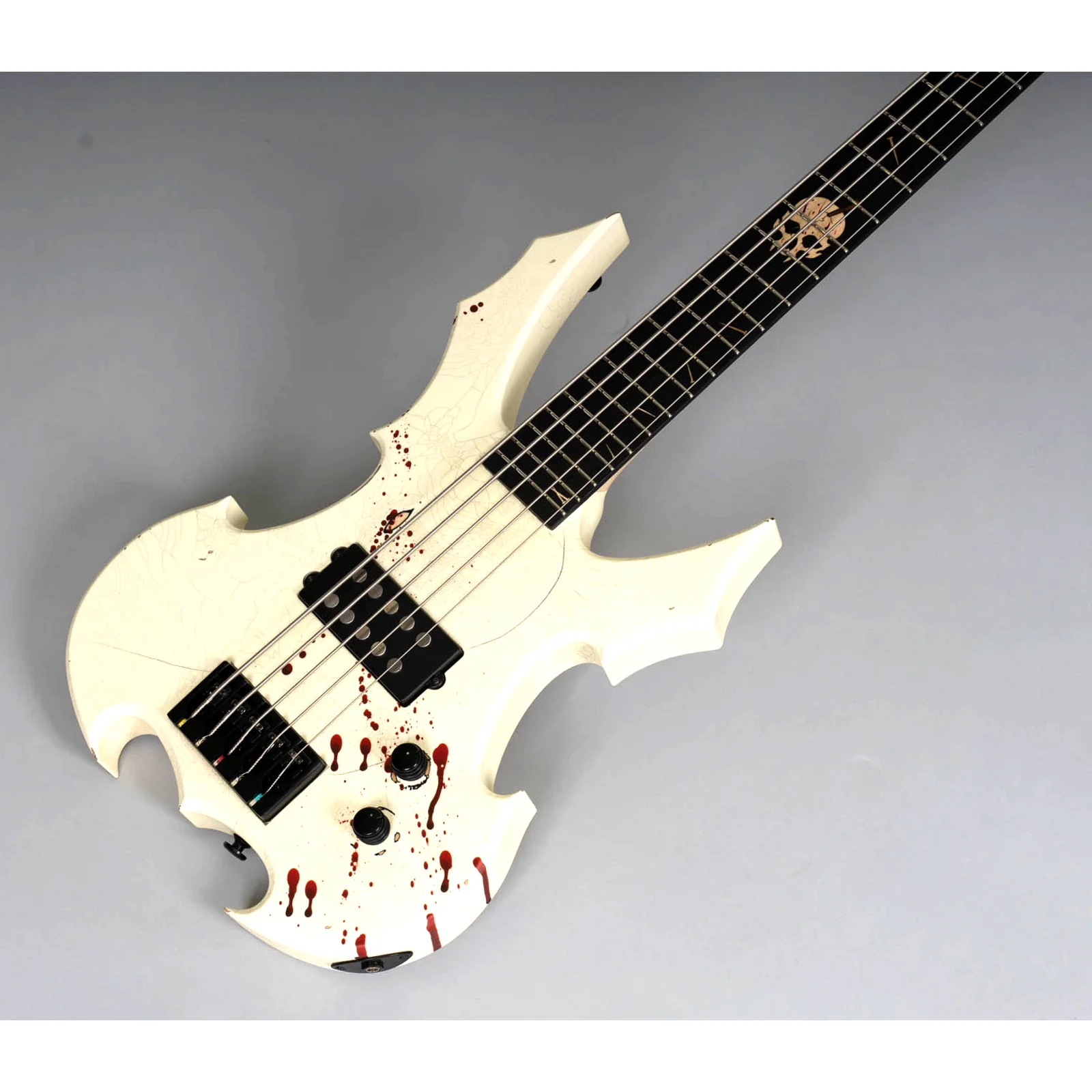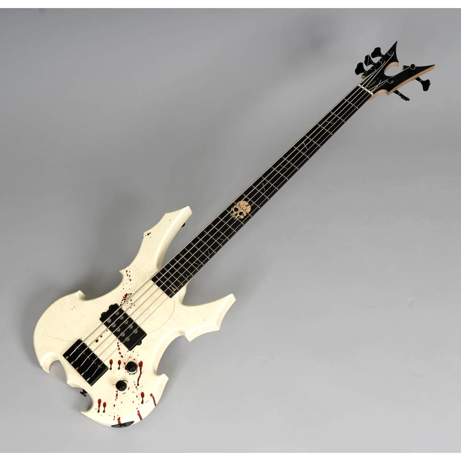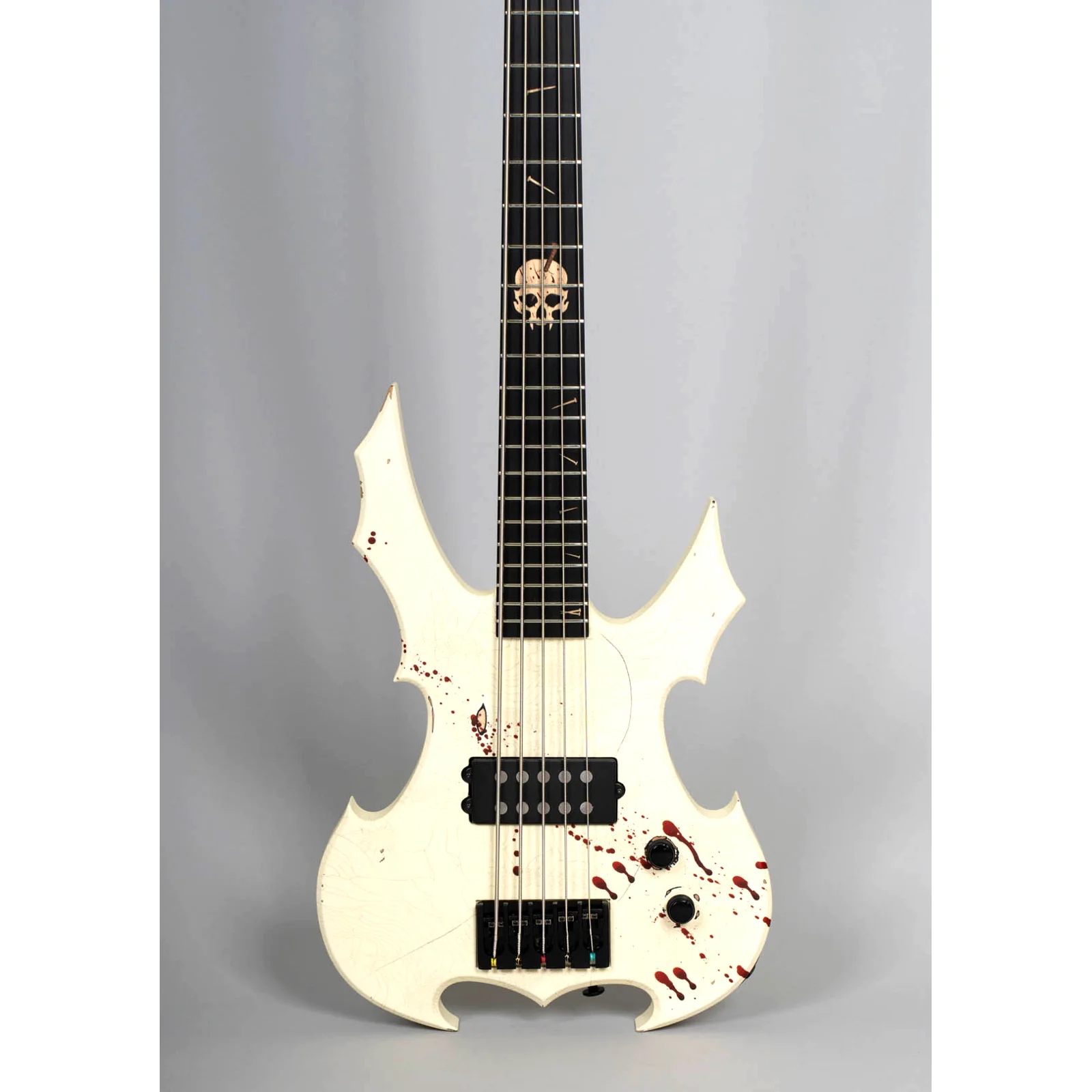 Der MGH Guitars Protector Bass 5 verbindet kompromissloses Metal-Design mit professioneller Performance: Skulpturaler Korpus, Cracked-White Finish mit Blood-Splatter und ein druckvoller MMHB5 Bridge-Humbucker liefern Präsenz, Punch und präzises Low-End – live wie im Studio.
