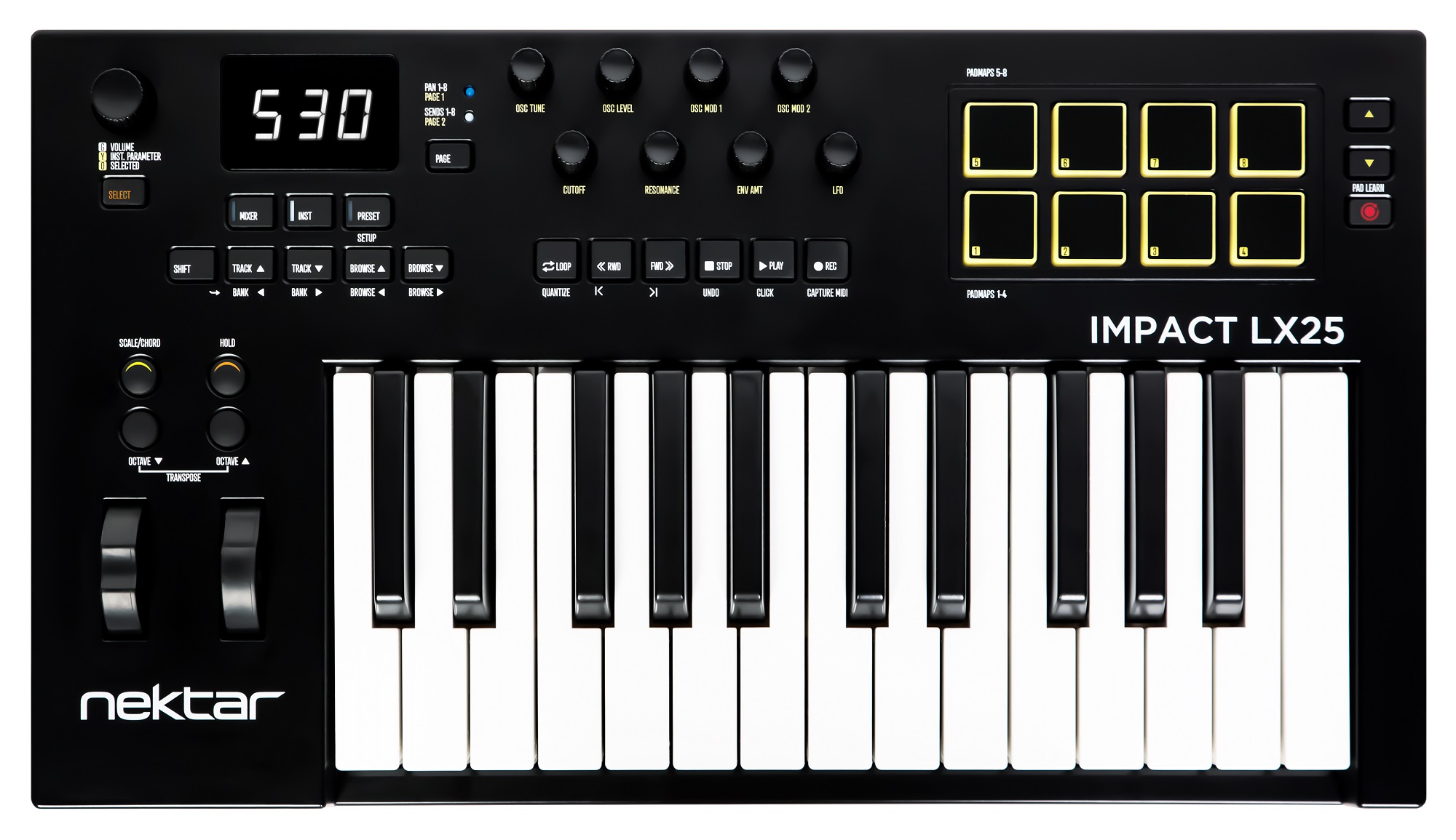 - Großer Encoder mit voller Auflösung für die globale Steuerung, wahlweise mit 7-Bit- oder 10-Bit-Feinsteuerungsauflösung über Nektar - DAW-Integration