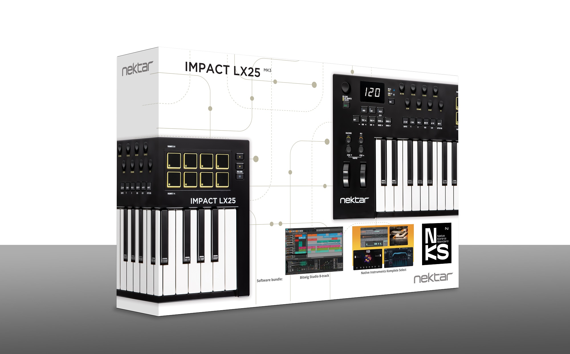 Impact LXmk3 verfügen über eine verbesserte Benutzerfreundlichkeit dank einer unglaublichen Timeline- und Looper-Steuerung sowie der "Selected Control"-Funktion, die erstmals in Panorama CS12 eingeführt wurde. Die tiefe DAW-Integration von Nektar ist kompatibel mit den wichtigsten DAWs wie Ableton Live Suite, Bitwig Studio, Cakewalk/Sonar, Cubase (13 oder höher), FL Studio, Garageband, Nuendo, Logic Pro (10.8 oder höher), Reason, Reaper und Studio One (5 oder höher).