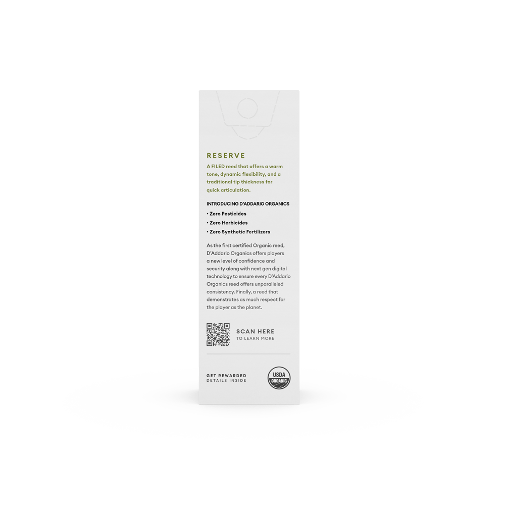 Die Organic Reserve Blätter bieten dank ihrem langen Ausstich dynamische Flexibilität und eine außergewöhnliche warme Klangqualität. Diese filed Blätter verfügen über eine traditionelle Spitze, die eine einfache Artikulation und Ansprache ermöglicht.