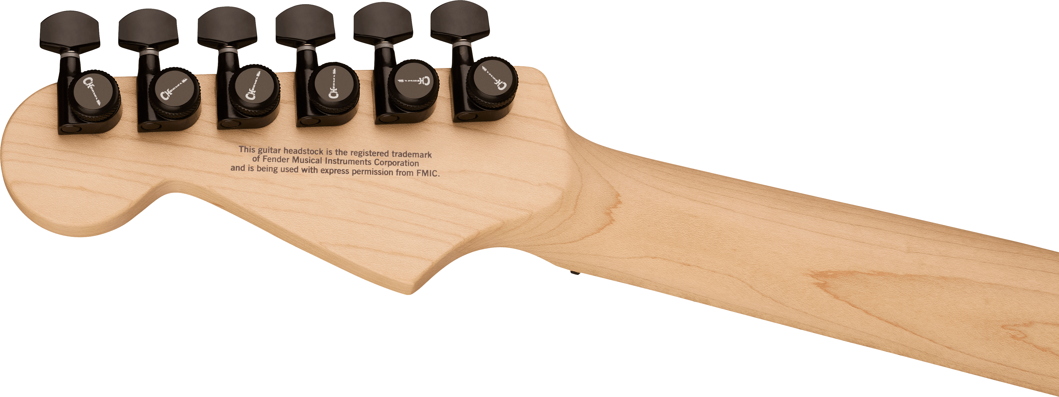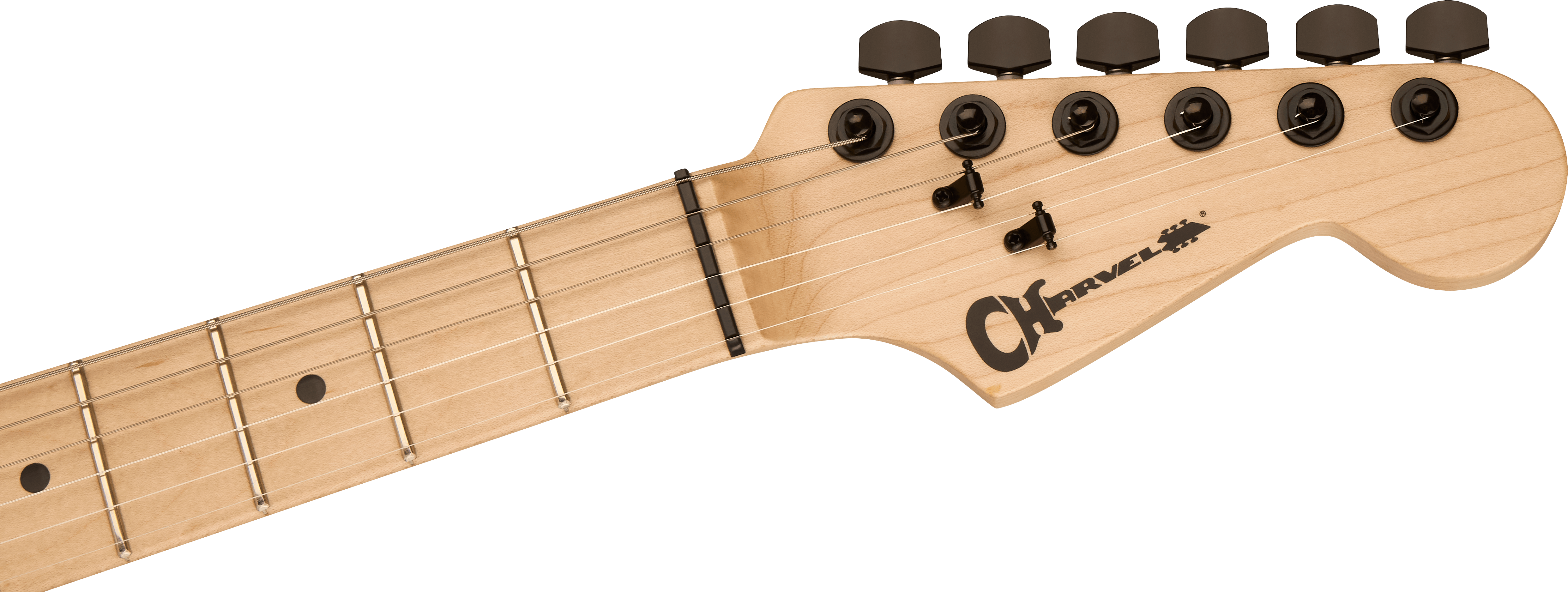 Hinter dem Lautstärkeregler verbirgt sich ein Push/Pull-Spulensplit für noch mehr nützliche Klangvariationen, ideal für alles von einem bissigen Leadsound bis hin zu dicker, klobiger Rhythmusarbeit. Der No-Load-Tonregler funktioniert von Position eins bis neun wie ein normaler Tonregler und schaltet sich in Position zehn ab, um einen transparenten Sound zu erzeugen, der die natürliche Stimme der Gitarre voll zur Geltung kommen lässt. Eine Charvel HT6 String-Through-Body Hardtail-Brücke sorgt für eine verbesserte Intonation, mehr Sustain und Resonanz.