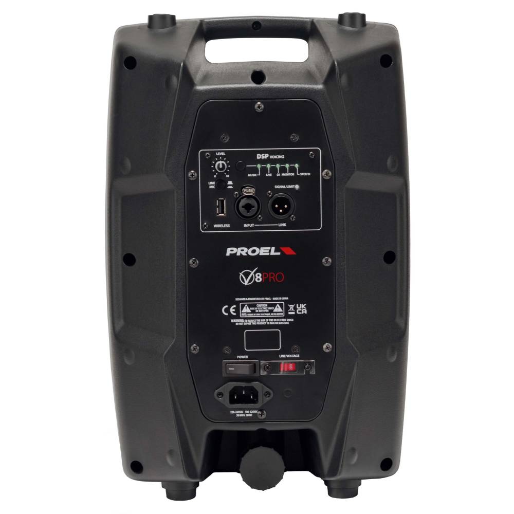 Das innovative Gehäusedesign mit komfortablem Tragegriff sorgt für einfaches Handling. Dank der Multifunktionsbauweise kann die V PRO sowohl als FOH-Lautsprecher als auch als Monitor verwendet werden. Zudem bietet sie MIC/LINE-Eingänge und einen WIRELESS-USB-Port für den Einsatz mit PROEL U24-Mikrofonsystemen – ganz ohne externe Geräte.