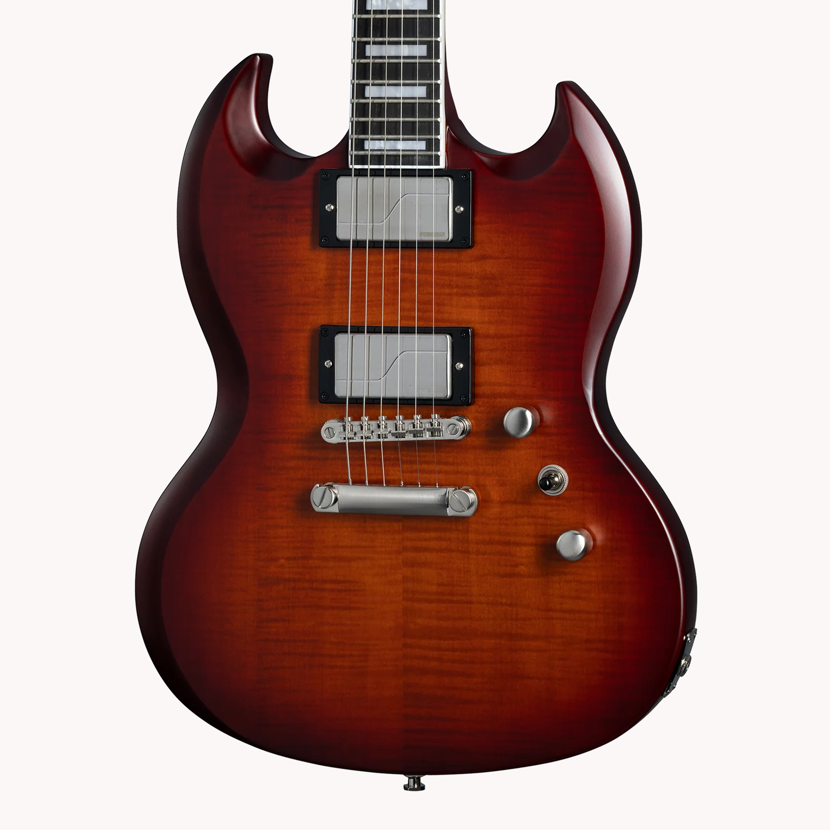 Die Epiphone SG Prophecy Aged Jet Bengal Tiger Burst ist eine moderne Interpretation des klassischen SG-Designs, die sich an Gitarristen richtet, die sowohl traditionelle Ästhetik als auch zeitgemäße Features schätzen. Mit ihrem auffälligen Aged Bengal Tiger Burst Finish und hochwertigen Komponenten bietet sie sowohl optisch als auch klanglich ein beeindruckendes Gesamtpaket.
