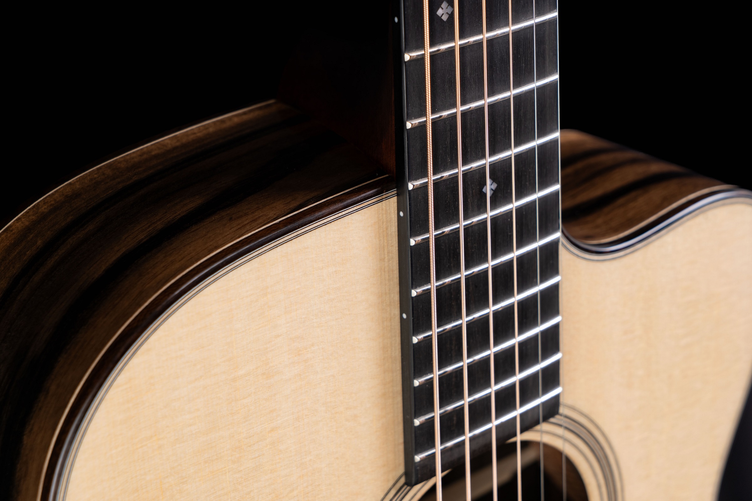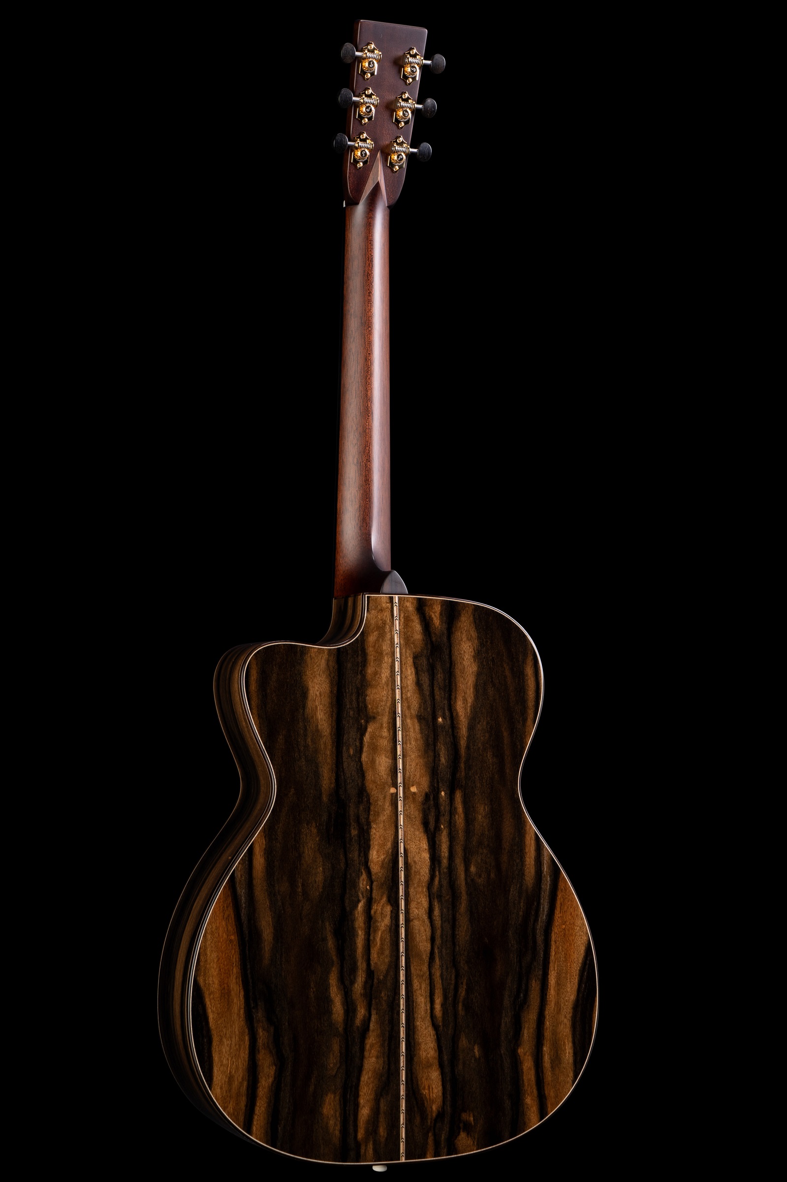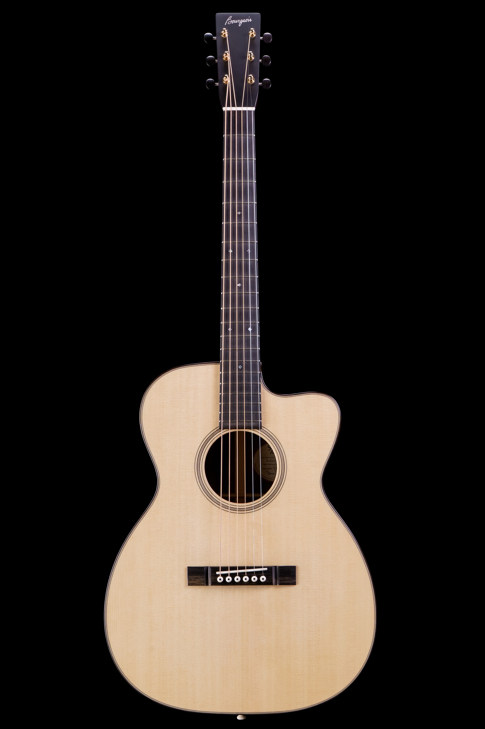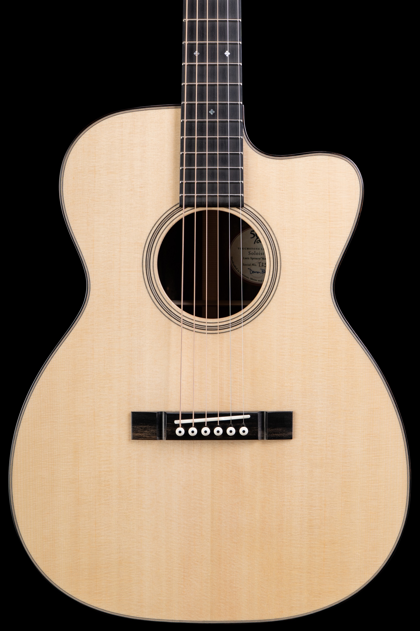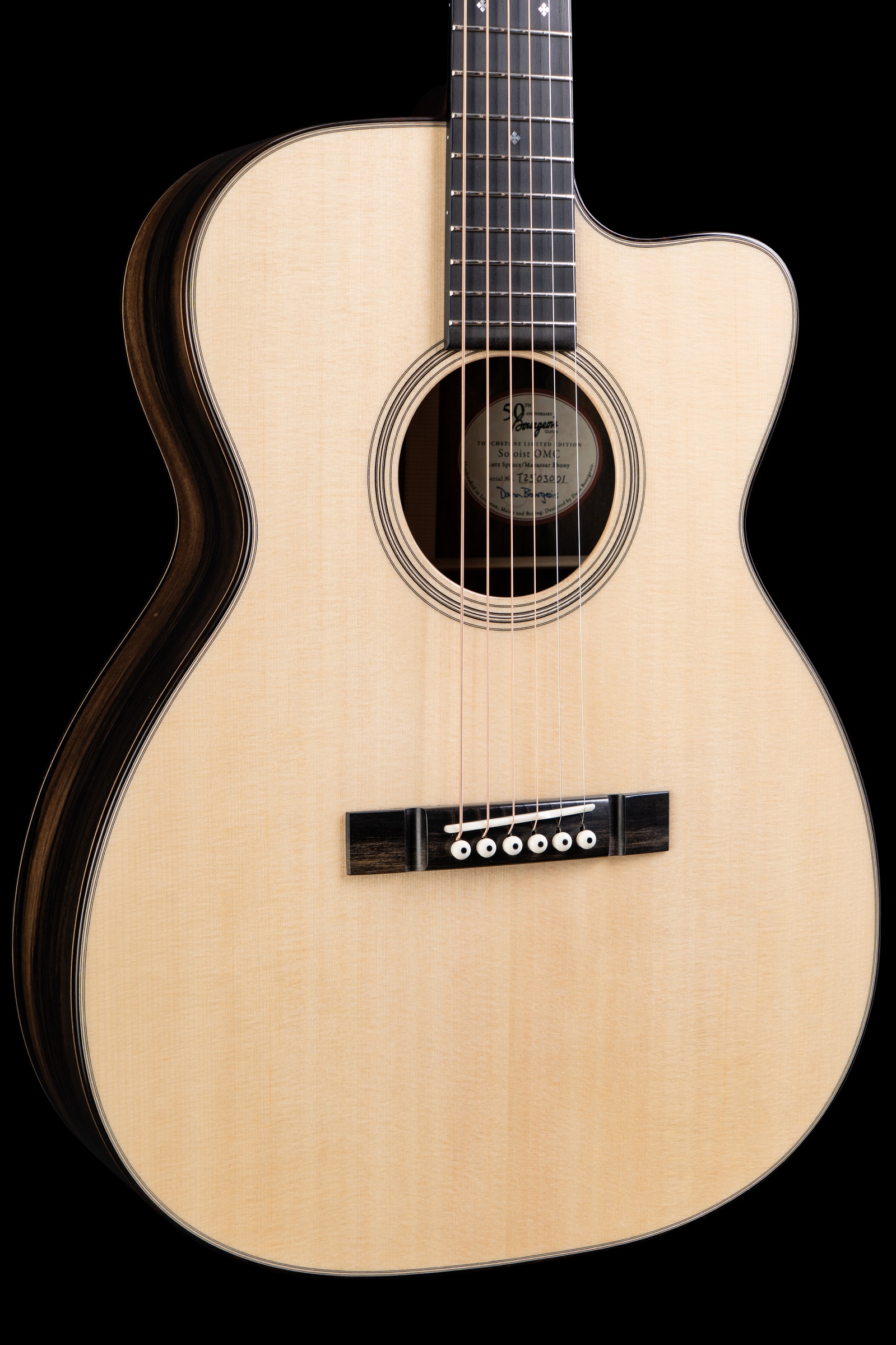 Die Kombination aus einer handgestimmten Lutz-Fichtendecke und Ebenholz für Boden und Zargen ergibt einen beeindruckenden Klangcharakter: warm, klar und reich an Obertönen, mit einem artikulierten Bassfundament und langem Sustain. Das charakteristische OMC-Cutaway-Design sorgt nicht nur für komfortablen Zugang zu den oberen Lagen, sondern verleiht der Gitarre auch eine elegante Silhouette.