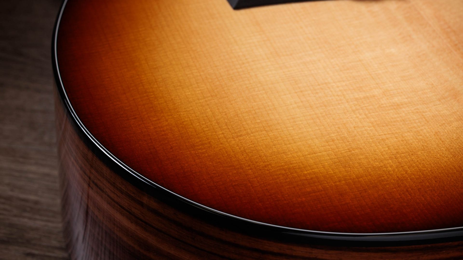 Mit ihrem Grand Auditorium-Korpus und dem Cutaway verbindet sie klassische Klangfarben mit dynamischer Präsenz. Die Decke aus massivem torrefiziertem Fichtentonholz erzeugt eine sofort vertraute, gereifte Wärme – ein Charakterzug, der durch den laminierten Korpus aus indischem Palisander perfekt ergänzt wird: brilliante Höhen, samtige Mitten und ein rundes Bassfundament sorgen für ein detailreiches, inspirierendes Klangbild.