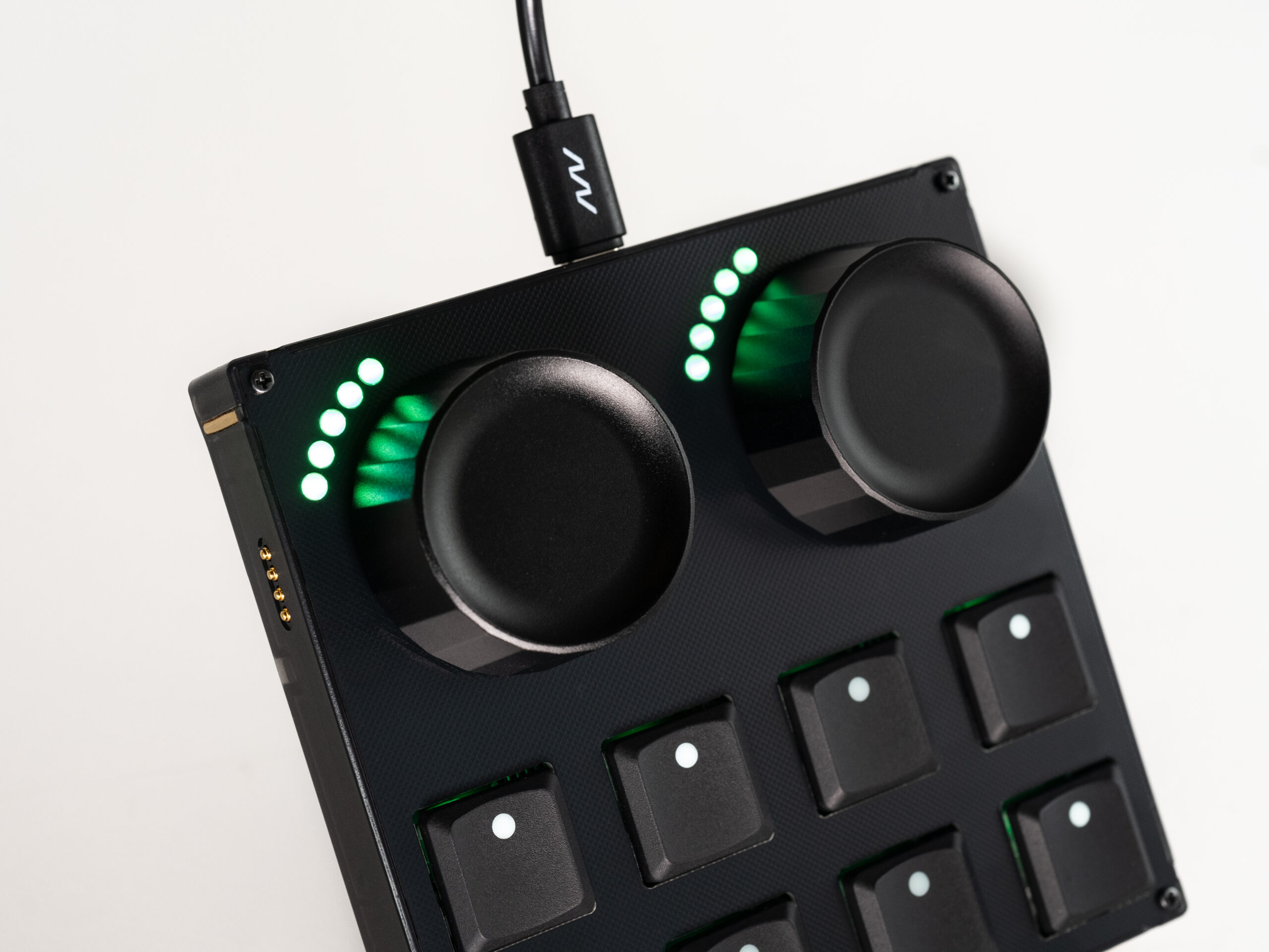 Die Taster verfügen jetzt über MX Gateron Hall-Effekt-Schalter mit Anschlag- und Druckempfindlichkeit, was ein dynamisches, reaktionsschnelles Spiel erlaubt. Jede Taste ist mit einer RGB-LED hinterleuchtet, die durch die ausgeschnittenen Standard-Keycaps stets gut sichtbar bleibt. Die Tastenkappen sind austauschbar und lassen sich flexibel an Haptik, Layout oder Beschriftung anpassen – passend zu deinem Workflow.Die Jogwheels bleiben sanft laufend und endlos drehbar, verfügen über eine integrierte Druckfunktion und sind von 5-farbigen LED-Ringen umgeben, die in Echtzeit visuelles Feedback geben. Ein zentrales 5-Bit-Display zeigt zusätzlich Informationen wie Mittelstellungen oder Parameterwerte an. Die neue strukturierte Fiberglas-Frontplatte sorgt für bessere Griffigkeit und erhöhte Langlebigkeit.