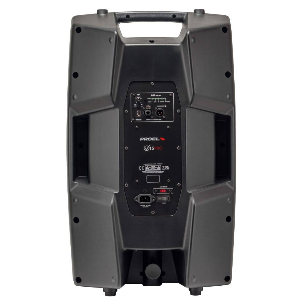 Die abgeschrägte Form ermöglicht es, die Lautsprecher auf die Seite zu legen und auch als Bühnenmonitore zu verwenden.Dank des MIC/ LINE-Eingangs und des WIRELESS USB-Eingangs für die Verwendung von PROEL U24-Mikrofonsystemen können die V PRO in einer Vielzahl von Anwendungen ohne externe Geräte verwendet werden.
