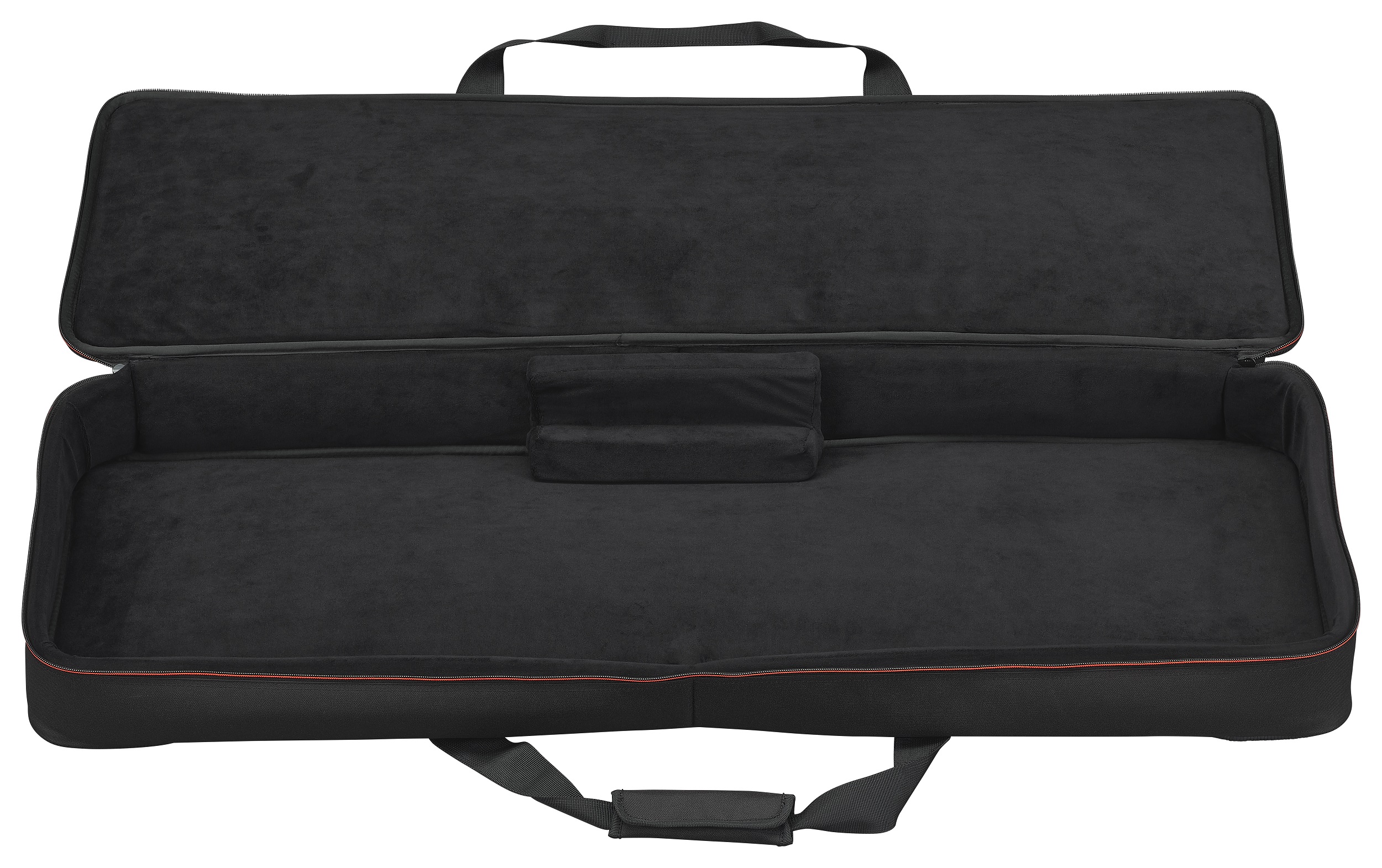 Eine aufgesetzte Zubehörtasche bietet ausreichend Platz für Pedale, Kabel oder Netzteil – praktisch für Musiker:innen, die alles kompakt und griffbereit mitnehmen wollen. Die große Trageschlaufe, der stabile Rückengriff und die gepolsterten Schultergurte ermöglichen unterschiedliche Tragevarianten – ob in der Hand oder bequem als Rucksack.